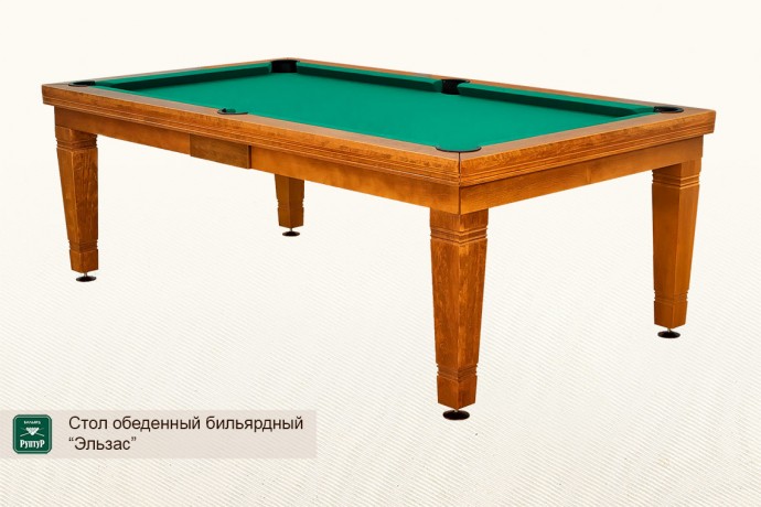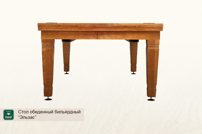 Элегантный обеденный стол на 12 персон. Прекрасно вписывается в домашний интерьер. После снятия столешницы превращается в бильярд размером 6,5 футов, который оборудован системой ската шаров к середине длинного борта, встроенными двумя пеналами для хранения четырех киев и полкой для шаров.